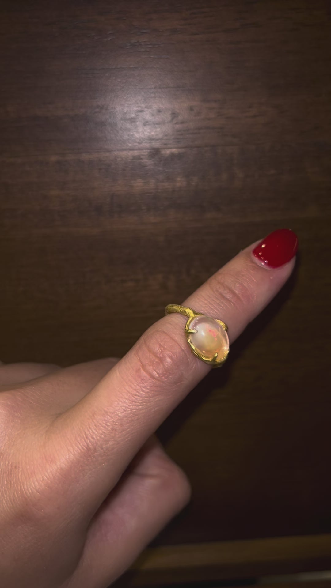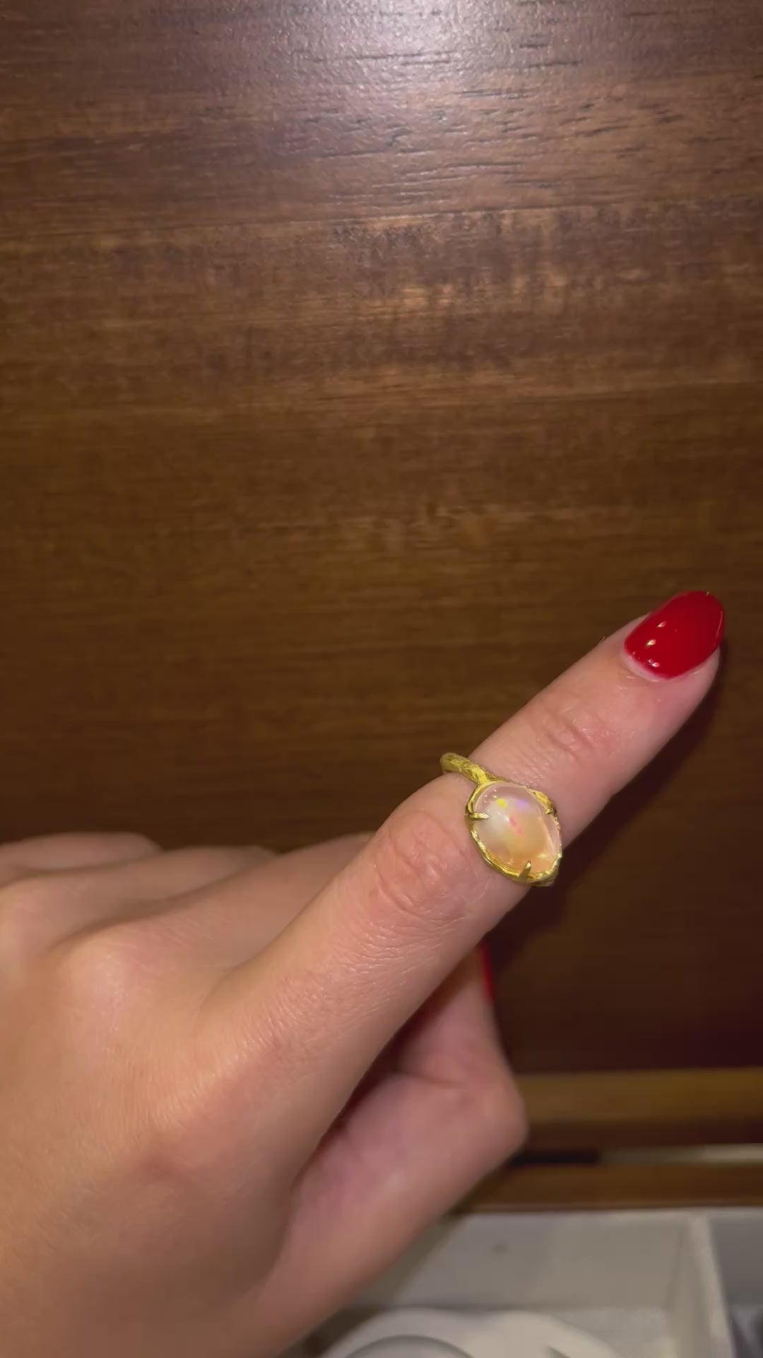 透明のメキシカンオパールの奥には、やわらかく揺れる雲のような模様と、虹色の光が共存し、指先に幻想的な風景を映し出しまるで空を閉じ込めたかのような不思議な奥行きを感じさせます。